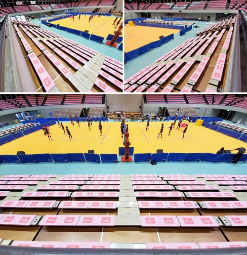 ヴィクトリーナ・ウインク体育館でのホームゲームの際に、1階に設置されるアリーナ席を快適に、より応援に集中していだける環境にとのご要望で、専用のクッションシートを設置いたしました。