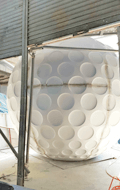 ゴルフ練習場の大型造形看板で3mのゴルフボールを製作中。
