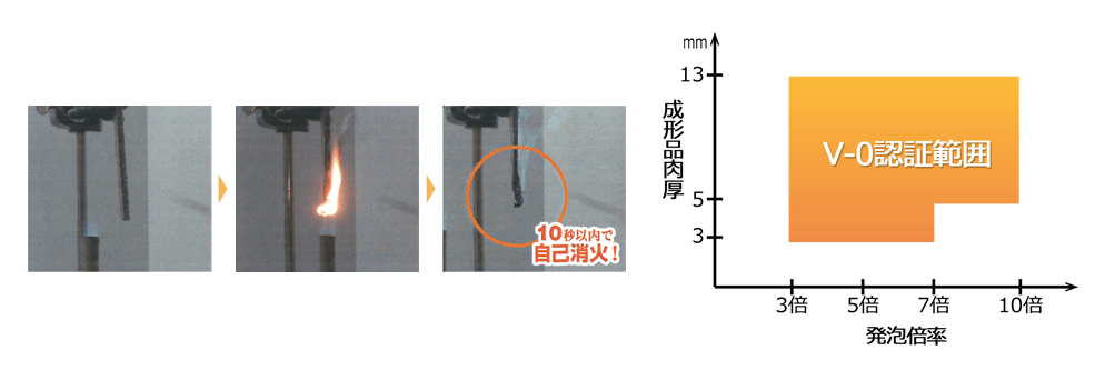 (UL No.E345167) 10秒以上接炎を行い燃焼時間を測定した結果、10秒以下で試験体が垂れることなく自己消化し、UL94規格V-0を達成