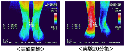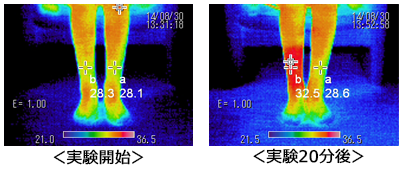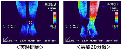 ペチカ・スマートを向かって左側の足だけに装着、実験開始時と実験開始20分後の表面温度を、サーモグラフィーで測定しました。
