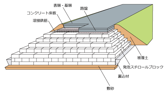 発泡スチロール土木工法(EPS工法)とは大型の発泡スチロール(EPS)ブロックを盛土材料として積み重ねていくもので、材料の軽量性、耐圧縮性、耐水性および積み重ねた場合の自立性等の特性を有効利用する工法です。