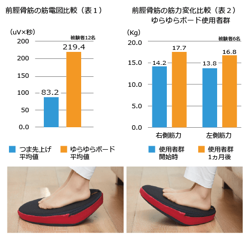 この度、兵庫県立大学環境人間学部健康教育学研究室のご協力で、「1回30ゆらゆら×週3回を1か月実施した結果、つま先を上げる筋肉である【前脛骨筋】の筋力がアップする」というデータが取得できました。