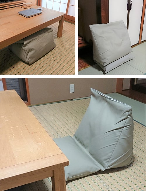 ちなみに私は、座椅子として、あぐら座り・靴下を履くとき・背もたれクッション・ごろ寝クッション・足上げクッションとして使っています。