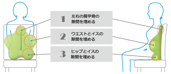 大きな左右のふくらみは、ウエストを左右から包み込み、ウエストとイスの隙間を埋めます。