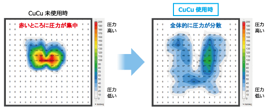 CuCu シリーズを使うと、背中~腰にかけて身体を支える面積が増え、背中にかかる体圧を分散させます。実際にCuCu スタンダードを使用せずに座った時と、使用して座った時の体圧を測定してみました。