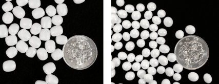ポリエチレン製の「やわらか-エアビーズ®」と、ゴムまりのような弾力特性を持つ「軽量ハイブリッド-エアビーズ®」を混合したビーズです。