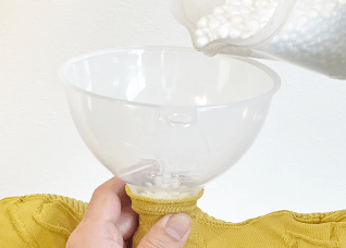 ファスナーを開け、封入口を引っ張り出し、じょうごと計量カップを使用して補充ビーズを入れてください。