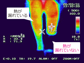 結果はハイソックスのみの足は多くの体温が外に漏れ出しているのに対し、CAHANの表面にはほとんど体温が漏れておらず、双方の表面温度差は約10℃となりました。