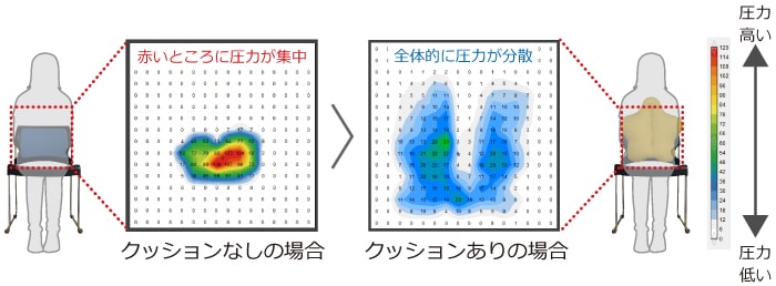 CuCu クイーン ami(下図内表記:クッション)を使用していない時と使用した時の、背中の圧力を測定しました。CuCu クイーン amiを使用した時の方が、使用していない時に比べ、圧力が広い面積に分散したことが分かります。