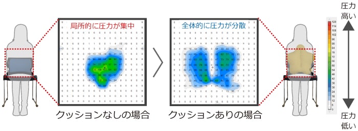 CuCu スタンダード ami(下図内表記:クッション)を使用していない時と使用した時の、背中の圧力を測定しました。CuCu スタンダード amiを使用した時の方が、使用していない時に比べ、圧力が広い面積に分散したことが分かります。