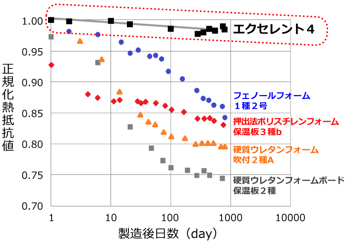 他素材と比較し、性能が経年劣化しにくい素材です。発泡プラスチック断熱材の製造直後からの正規化熱抵抗値の経時変化