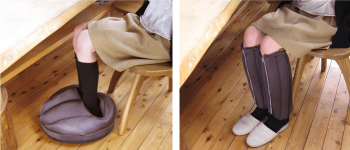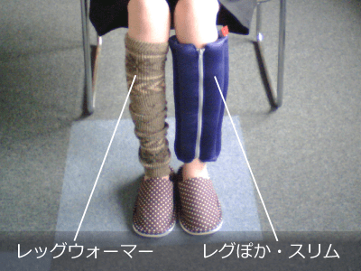 向かって左足に一般的なレッグウォーマー、右足にレグぽか・スリムを装着。