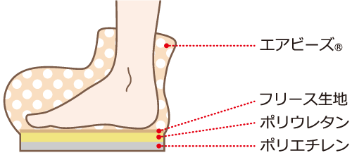 底材はフリース生地、ポリウレタン、ポリエチレンの三層構造。