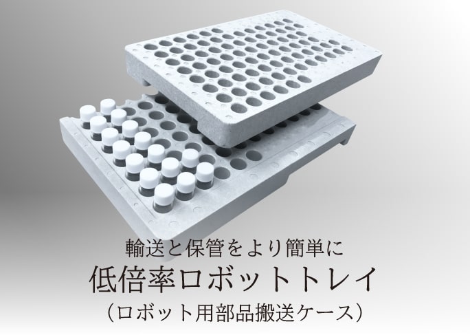 「低倍率ロボットトレイ」は、小径の原料を使用するため、精密部品に対応した形を成型することができ、帯電防止性能を持つ原料を使用するため静電気による製品の破損を防ぐこともできます。