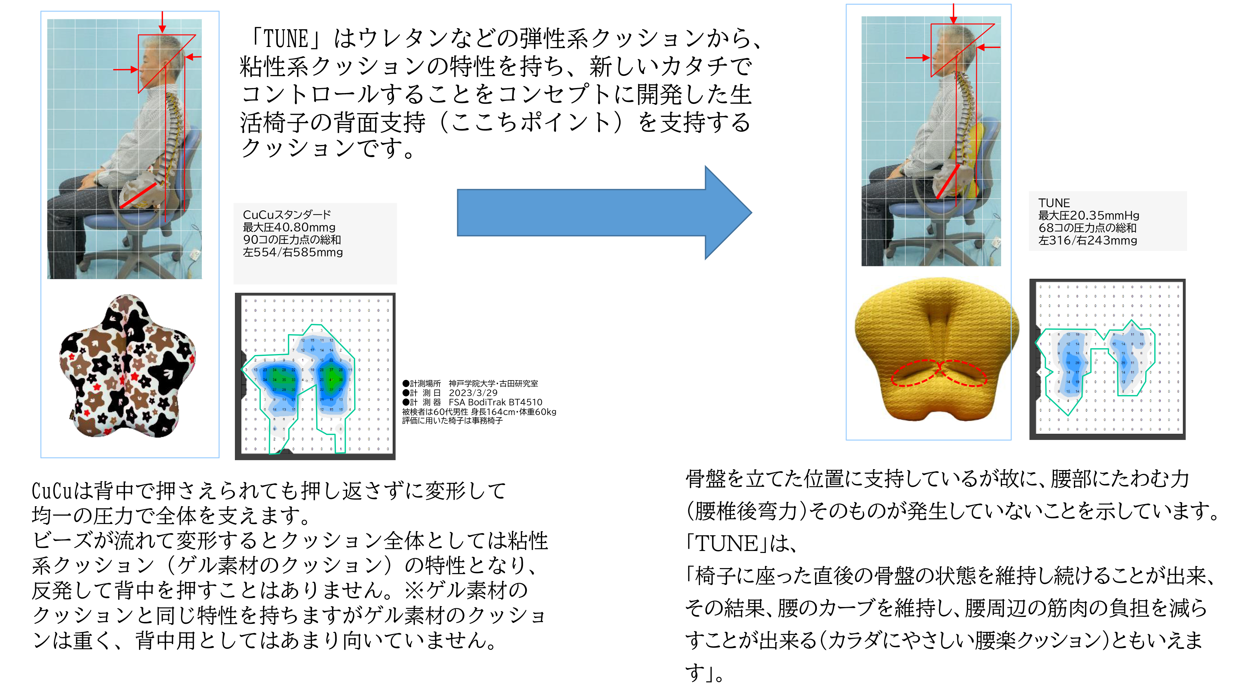 従来の腰用クッション「CuCu」の機能性を損なわず、お部屋との親和性の高い「日本製」にこだわりぬいた腰用クッションです。