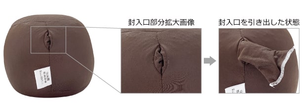 ・本品は食べられません。万一中材のビーズがこぼれた際は、お子様やお年寄りの口や目などに入らないようご注意ください。口や目に入った場合は洗浄してビーズを取り除いて下さい。大量に飲み込んだ場合は喉に詰まり窒息する恐れがあります。口の中に残っているものをかき出し、速やかに専門医の手当てを受けて下さい。