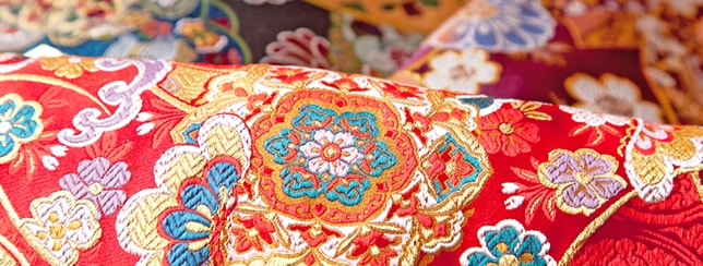 西陣織とは、多品種少量生産が特徴の、京都(西陣)で生産される先染の紋織物の総称です。昭和51年2月26日付で国の伝統工芸品に指定されました。西陣という行政区域は特別にはありませんが、西陣織にたずさわる業者がいる区域は、京都市街の北西部に位置し、上京区、北区を中心に、おおよそ南は丸田町通、北は上賀茂、東は烏丸通、西は西大路通に囲まれたあたりを指します。