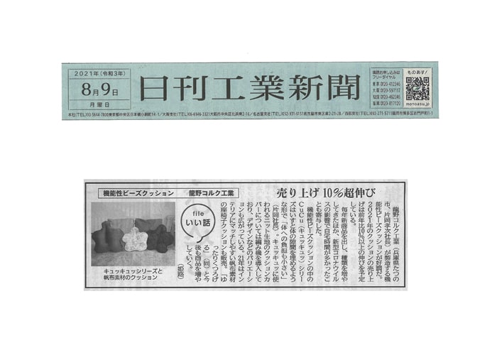 イベント情報・トピックス 『日刊工業新聞』にて「CuCu」が紹介されました 2021年8月9日 『日刊工業新聞』(2021年3月8日)にて、腰用クッション「CuCu」が紹介されました。 (画像クリックでPDFが開きます) ←TOPページに戻る