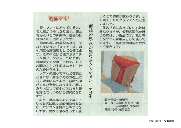 『西日本新聞』(2021年9月2日)内、高齢生活研究所・浜田きよ子先生のコラムにてイーザシリーズ「ヨイチ」が紹介されました。
