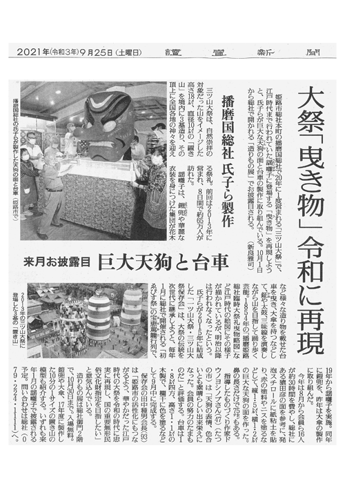 『読売新聞』(2021年9月25日)にて、以前お知らせいたしました「~伝統を再現する~ 造りもの展」にて展示されております、曳き物が紹介されました。