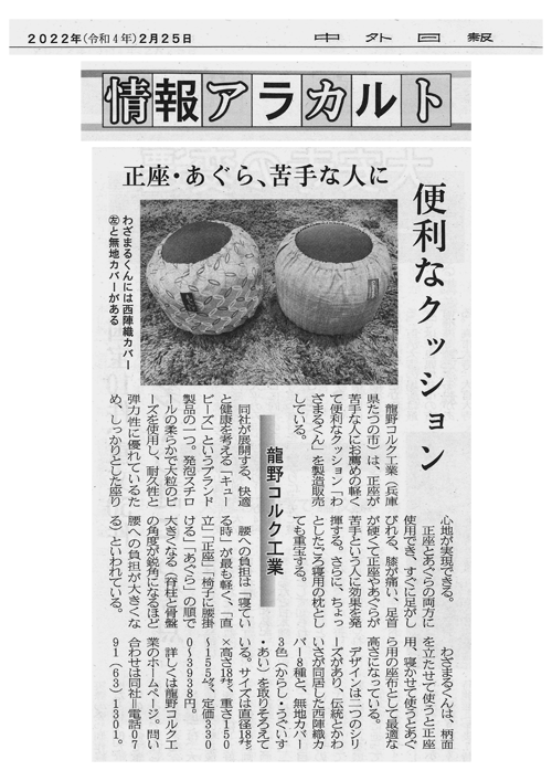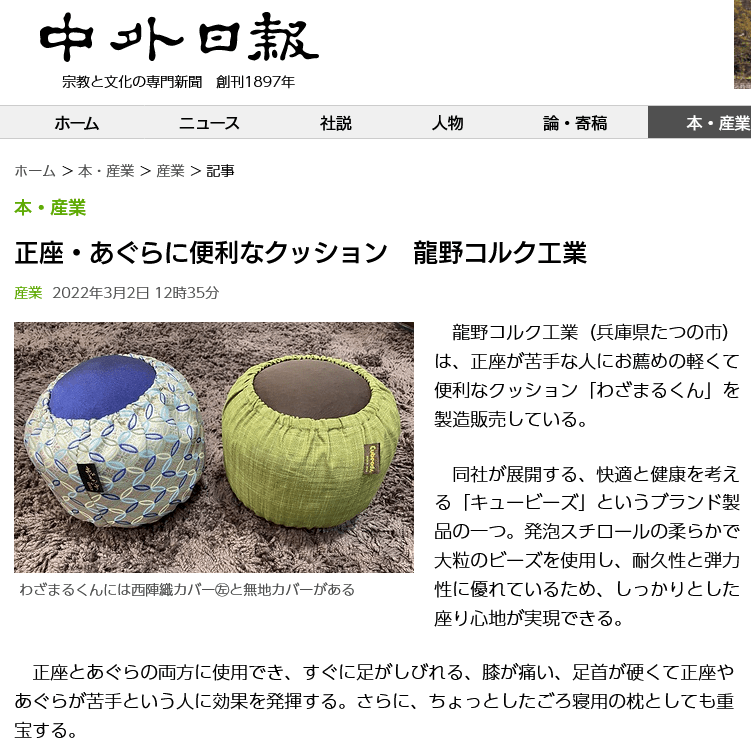 [産業]正座・あぐらに便利なクッション 龍野コルク工業:中外日報龍野コルク工業(兵庫県たつの市)は、正座が苦手な人にお薦めの軽くて便利なクッション「わざまるくん」を製造販売している。同社が展開する、快適と健康を考える「キュービーズ」というブランド製品の一つ。