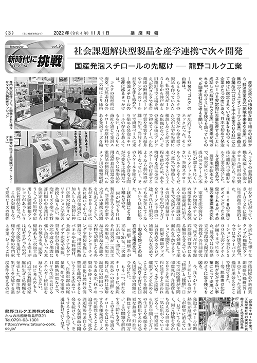 イベント情報・トピックス 『播磨時報』にて弊社が紹介されました 2022年11月1日 『播磨時報』(2022年11月1日)にて、弊社が紹介されました。 (画像クリックでPDFが開きます) ←TOPページに戻る